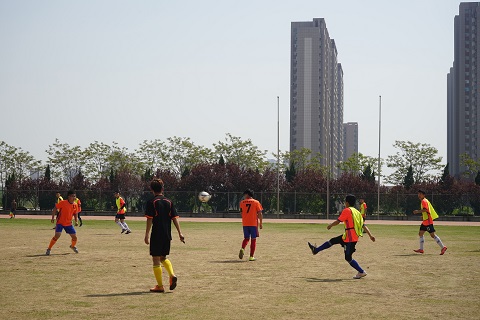 比赛伊始,两院系球员进行友好问候并由裁判强调“友谊第一,比赛第二”的原则。随后,两院系同学迅速进入状态,开始进行激烈角逐。上半场,外语系球员就展现了高超的球技,躲闪、颠球、铲球等连续上演,共进两球。下半场我系球员士气高涨,努力拼搏,连进四球,将比分定格在6:0,完胜教师教育学院。