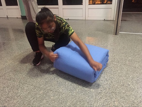 比赛采取淘汰制,分两轮进行评比。第一轮,要求同学们须在三分钟内将军被整理完毕并予以展示。参赛选手各就各位,随着一声“开始”,各位选手立即投入 “战斗”,一抖一铺、一压一折、一叠一掐、一整一摆,每一步都利落娴熟。第一轮比赛结束后,有3名选手晋级第二轮。第二轮比赛规定选手们交换被子并在紧迫的时间内完成规定内容。现场气氛紧张而严肃,晋级选手有条不紊地进行着“平铺、横拆、画线、竖折、修边、扯角”等各个动作。经过激烈的比拼,最终,我院推选了出一名同学代表我院参加校级叠军被大赛。