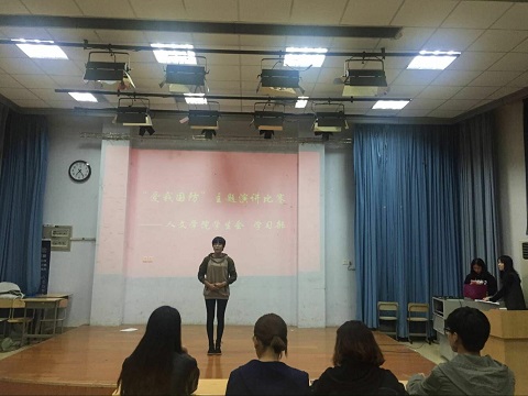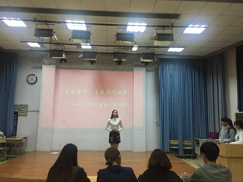 为庆祝中国人民解放军建军90周年,迎接党的十九大胜利召开,增强我校大学生的责任感和使命感,推进我校精神文明建设。1020日,我院于4号教学楼106教室参加由人文学院举办的“爱我国防”主题演讲比赛。我院姚怡、李倩两位同学代表我院参加此次比赛。