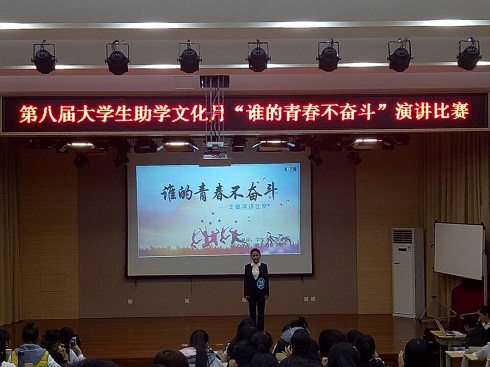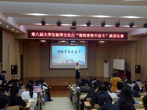 本次演讲比赛的主题为“谁的青春不奋斗”。比赛开始,先由主持人上台致开场词,并说明了此次比赛的规则。随后,选手们依次上台演讲,我院武丽云同学以一段流利的英语开场,结合身边人的故事,向我们讲述了青春奋斗的必要性。而王亚楠同学则以自己的高三经历为背景,讲述了她的青春奋斗的故事。最后,评委老师针对选手们的表现作出了精彩点评,紧接着主持人上台致结束语,此次比赛圆满结束。