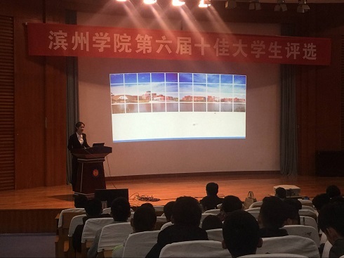 活动伊始,主持人致辞,就此次活动的规则及流程做了详细介绍。随后,各个学院代表共20名同学依次上台演讲。每一位参评同学都有着优异的成绩和令人骄傲的各类获奖证书,他们向大家展示了了各学院学生全面发展的风采。在此次评选演讲中,我院葛雯同学从学习、工作等方面全面介绍了自己,并最终以第七名的优异成绩荣获滨州学院第六届十佳大学生荣誉称号。