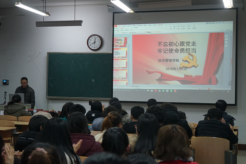 1月5日晚上7点半,滨州学院党的十九大精神宣讲活动在7号教学楼107教室举行,此次宣讲会由经济管理学院学生管理科科长王泰宁老师和机电工程学院副科级辅导员靳雪银老师主讲,申慱sunbet官网党总支靳成学副书记主持,申慱sunbet官网、体育学院、理学院学生代表参加此次宣讲活动。