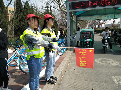 活动开始,同学们抵达了滨州学院南门,在工作人员的带领下,逐渐熟悉了工作流程,了解了注意事项。志愿者首先对学生们发放了相关安全知识的宣传画报,讲解了违法交通法规的危害。随后,工作人员将同学们分为两组,分别进行“安全知识讲解”和“交通指挥”两方面的工作。由于在马路上工作,车流量大,知识讲解的同学们在尽量不妨碍交通的情况下,尽职尽责地传播文明交通知识,本着“奉献,友爱,互助,进步”志愿服务精神,认真完成自己的任务。指挥交通的同学手拿红旗,摆着标准的姿势,认真且谨慎地做着指挥,对违反交通规则的同学及时劝解,所有同学都专注于自己的工作。最后,所有参加活动的同学在滨州学院南门门口前面合影纪念。