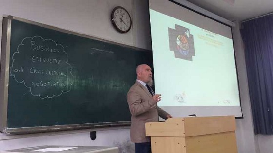 2018年4月13日,法国阿尔萨斯葡萄酒学院院长Stanislas d’Eyrame(斯坦尼斯拉斯.德汉姆)教授对滨州学院进行了友好访问并于13日下午16:00-18:00在7教210为学院师生做了主题为跨文化商务礼仪的讲座。斯坦教授此前曾任法国南锡商学院国际管理项目负责人,中国校区校长。作为战略管理学教授,经济学和管理学双博士,其教学经验丰富,注重国际交流。申慱sunbet官网法语专业、商务英语专业和经济管理学院市场营销专业的部分师生参加了本次讲座。