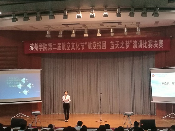 为加强学校航空文化建设,营造浓厚的航空文化氛围,增强学生对“建设以航空为主要特色的高水平应用型大学”的认同感,6月21日,滨州学院航空工程学院在学院会堂承办由共青团滨州学院委员会发起的第二届航空文化节“航空报国,蓝天之梦”演讲比赛决赛。申慱sunbet官网2017级英语师范本科2班李倩同学代表我院参加此次活动,辅导员马盛楠陪同该生参加此次活动。