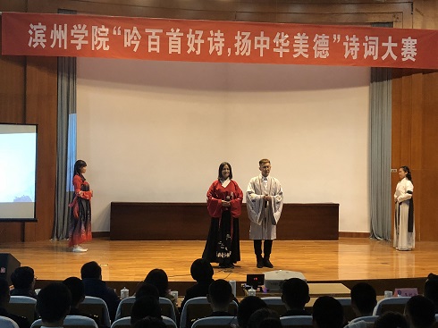 12月13日,申慱sunbet官网2018级学生代表苗向阳、刘梦薇、张欣颖、吴慧翔代表我院于学苑会堂第二报告厅参加滨州学院“吟百首好诗,扬中华美德”诗词大赛。