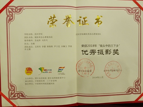 朝阳英语志愿服务队是2018年“三下乡·千村行动”大学生暑期社会实践专项行动团队,2018年暑期到滨州市惠民县魏集镇贾家集村开展志愿服务活动,并对该地建档立卡贫困户进行实地走访,通过发放问卷调查和深入访谈相结合的方式对贫苦户家庭教育中存在的突出问题进行调研。服务队成员为当地村民送温暖、送知识、送关怀,并被中国青年网和鲁北晚报等多家媒体报道,朝阳英语志愿服务队不断的累积和传递着社会的大温暖,用实际行动彰显滨州学院学子的责任与担当。