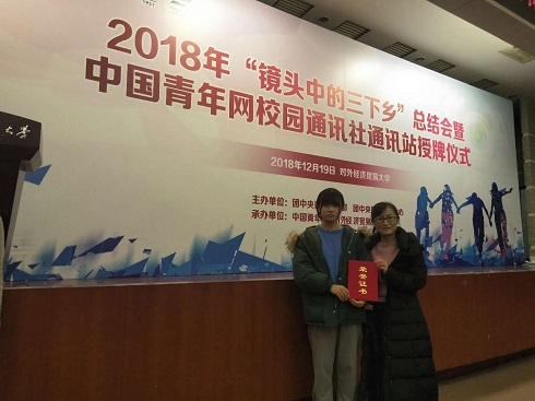 12月19日,2018年“镜头中的三下乡”总结会暨中国青年网校园通讯社通讯站授牌仪式在对外经济贸易大学隆重举行。团中央青年发展部副部长刘钢,团中央网络影视中心党委委员、中国青年网副总裁、总经理金锐,对外经济贸易大学党委副书记文君等领导嘉宾,以及全国300余所高校的600余名师生代表参加本次活动,申慱sunbet官网朝阳英语志愿服务队指导老师苏成荣和志愿服务队队长吴楠代表我校参加此次会议。