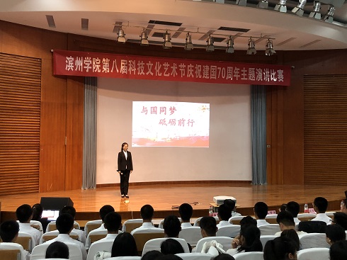 9月26日,申慱sunbet官网于滨州学院学苑会堂第二报告厅参加滨州学院第八届科技文化艺术节暨庆祝中华人民共和国成立70周年主题演讲比赛,2018级唐琪同学代表我院参加本次比赛。
