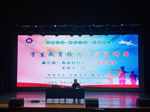 11月25日,滨州学院《有话好好说,你我幸福多——大学生人际沟通与交往》专题教育讲座于学苑会堂第一报告厅隆重举行。活动特邀校内专家宣讲团优秀教师陈秀珍为同学们进行宣讲。申慱sunbet官网辅导员及2019级全体同学参加了此次主题教育。