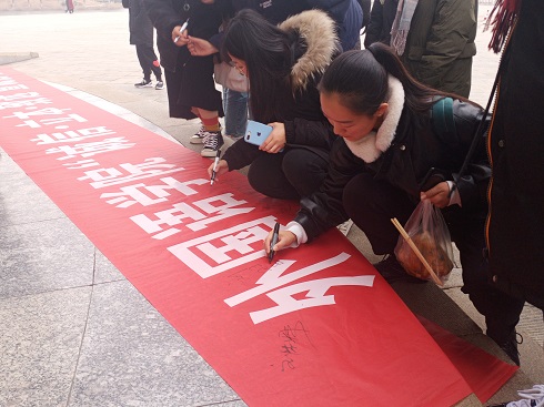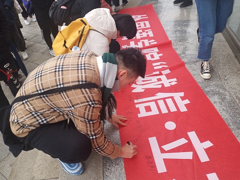 活动过程中,工作人员积极邀请各位同学在横幅上签字,并不断宣读诚信考试倡议书,诚邀各位同学携起手来,以诚实守信为荣,做诚信大学生,为严肃考风考纪、树立优良学风而共同努力。每位同学自信且意志坚定的在诚信应考的横幅上签下自己的名字,并保证遵守考试纪律。整个活动气氛庄重严肃,充分体现了同学们对诚信考试践行的决心。最后,参与此次活动的成员进行了合影留念。