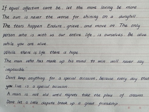 本次书写大赛,培养了同学们认真书写的意识,对同学们良好习惯的养成起到了促进的作用,丰富了校园文化生活。同时也激励着同学们练就一手漂亮的外语书法,为学好外语打下良好的基础。