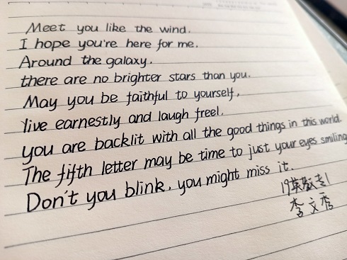 此次活动要求同学们在纸张上书写英语,法语或者俄语等第二外语为内容,以所学外语的单词字母为主线进行创作,同时保证作品的原创性与真实性。同学们发挥各自的所学与风采,认真书写,书写工整端正,成熟而具有美感,令人赏心悦目。同学们的作品有描写赞美自己父母的,有讲述自己喜爱的事物的,也有写给自己的朋友的,内容丰富多样,充满趣味。这些作品不仅让同学们锻炼了文笔,同时让对我们所学习的知识进一步掌握,也更加充分地展示了自我。