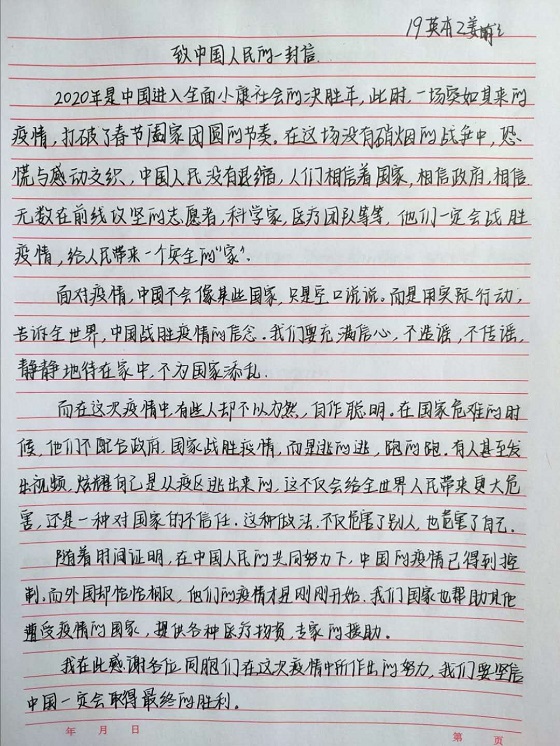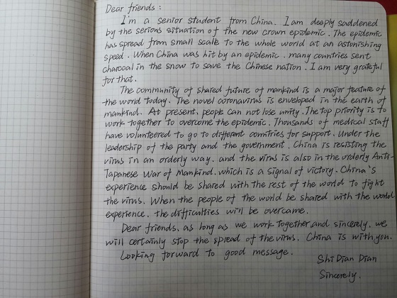 活动要求参与学生在保证作品原创性的前提下,以手写书信体的形式,紧扣“扁舟共济与君同”的活动主题,采用多种语言向世界传递诚挚问候。活动中,我院学子表现出高涨的热情,每一封书信都表达了同学们对世界抗疫人民的真挚情感,字里行间感受到学生的积极正能量。活动最后,学生会成员根据书信内容和字迹规范评选出优秀作品并予以奖励。