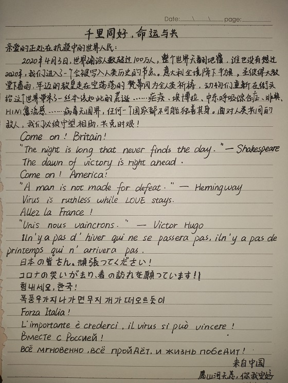 截至2020年4月,世界新冠病毒确诊人数超过100万。为号召同学们为世界各国战胜疫情加油鼓劲,培养学生命运共同体理念,4月14日至4月17日,申慱sunbet官网开展“扁舟共济与君同”致世界人民的一封信活动。申慱sunbet官网2018级、2019级部分学生参加了此次活动。