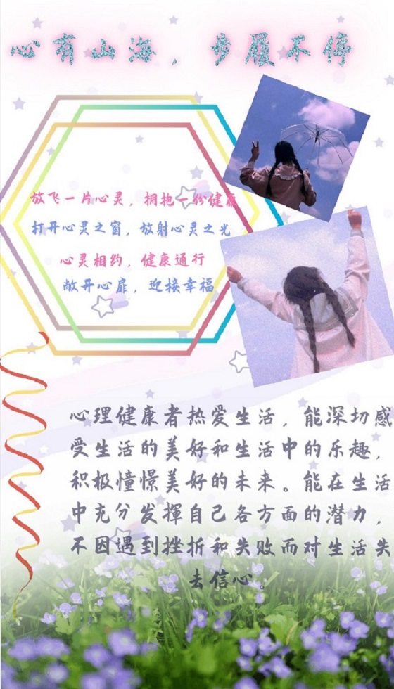 此次活动要求同学们以“心有山海,步履不停”为主题,运用电子版或纸质版的形式设计心理健康报刊。同学们在活动过程中以坚持原创,以心理健康知识的分享为主旨,发挥自己的创造力和想象力设计报刊。设计报刊中主要包含同学们的心理调试经验和心理健康知识,以绘画等形式为辅助,展现了同学们新颖的设计理念和清晰的逻辑思维。活动最后,学生会负责部门根据报刊设计的创新程度和创作理念评选出优秀作品,并给予了相应的奖励。
