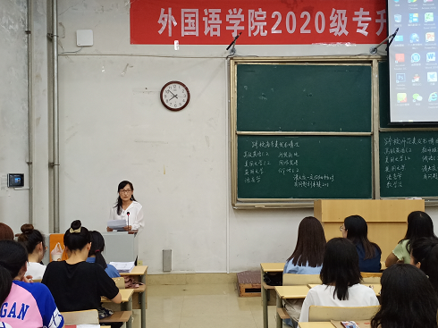 会议伊始,苏老师向同学们介绍了2019级辅导员梅竹、2020级辅导员张瑾两位老师,并对2020级专升本新生的到来表示热烈的欢迎,向同学们介绍学校概况,并重点介绍了我院的语言学习特色,以及学生在专升本和考研等方面取得的优异成绩。随后,苏老师对全体专升本学生进行了安全教育,向同学们指出了在新的大学生活与学习中应该注意的一些问题,强调要注意防范网络诈骗,远离校园贷,警惕校园传销活动,保护好自己的生命财产安全。在疫情防控工作的要求下,苏老师对学生的出勤管理、日常行为规范、宿舍达标制度做出了规定。会议最后,为巩固我校省级文明校园成果,苏老师提出同学们要注意文明守纪、文明用语、文明举止,严格遵守学生手册的相关规定。