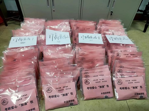 追梦路上,从不孤单。为让考研学子感受到学院领导老师及同学们的关怀,我院根据研究生入学考试需求,为231名考研学子精心备置了一份“考研爱心加油包”——其中包括了黑色签字笔、2B铅笔、橡皮、胶棒、小刀等考试用品以及祝福贺卡与暖贴等,寓意丰富、祝福满满。同时,在此次系列活动中,我院青年志愿者协会组织我院部分学生为考研的师哥师姐们制作了考研加油贺卡。卡片中的卡通图案生动有趣,祝福话语贴心真诚,温暖了正忙碌于备考的莘莘学子们。除此之外,申慱sunbet官网学生会各个部门和2020级部分同学为考研的师哥师姐们录制了祝福视频,为他们送上最真挚的祝愿与鼓励,并鼓励师哥师姐们一定要合理安排时间,调整好自己的状态,积极从容地迎接考试。一个个小小的举动温暖了人心,研路漫漫,有我们陪着你们,师哥师姐们,一定要加油欧!