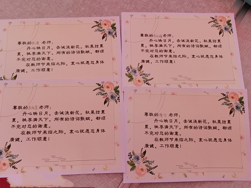 一支粉笔,两袖清风,三尺讲台,四季辛劳。老师的谆谆教诲,影响着我们的一生,虽然教师只陪伴了我们一段路,却是我们青春中浓墨重彩的一段。此次活动的开展,拉近了师生距离,学生们感受到了老师的默默耕耘,无私奉献,由衷地向老师表达着他们的敬意。推动感恩教育的同时,使老师们更加明确了自己“为国育才,请党放心”的教育使命,勇担教育使命,传道授业,为教育事业继续添砖加瓦。最后祝愿所有老师,节日快乐!