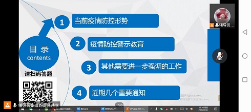 本次会议提高了同学们的疫情防控意识,强调了我校疫情防控期间的相关政策规定,增强了同学们封校、线上教学期间的的纪律意识,共同筑牢校园疫情防控的安全防线。