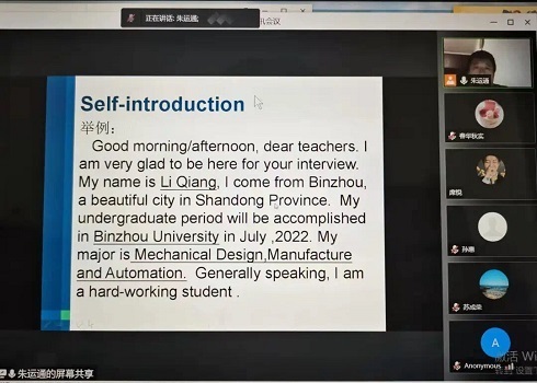 此次培训,朱运通老师结合多年指导研究生复试和英语教学经验,就2022年研究生复试中英语笔试、英语口语测试等环节为我校考研学子开展线上面试辅导,助力我校考研学子复试最后一公里。首先,朱运通老师简要介绍了英语笔试、英语口语测试形式、考试内容的各个环节,帮助同学们提前熟悉英语复试的基本流程。随后,朱运通老师讲解了考研线上复试的注意事项,英语自我介绍的写法和回答英语问题的技巧,为考研学子提出了具体可行的建议。最后,朱老师表达了对考研学子的关心并寄予祝愿,希望考研学生顺利通过复试,圆梦理想院校。