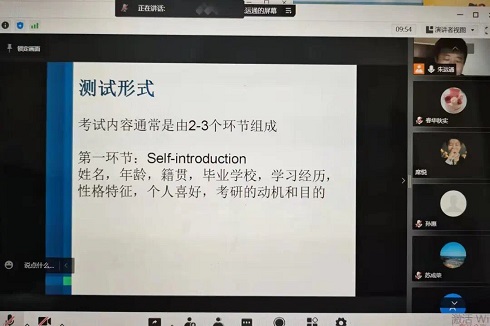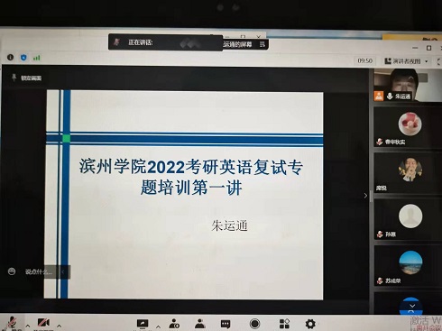 为进一步提高考研上线学子的成功录取率,持续推进“我为学生办实事”,根据《滨州学院2022年“学雷锋”志愿服务活动方案》和志愿服务专班工作的安排,3月30日晚,申慱sunbet官网开展“青春志愿行 助力考研复试最后一公里”英语复试专题培训活动,本次培训由丰富考研指导经验的英语专业教师朱运通老师主讲,来自18个学院的考研复试学子参加活动。