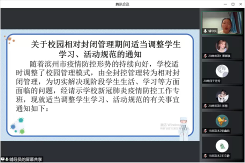 随着滨州市疫情防控形势的持续向好,学校适时调整了校园管理模式,由全封控管理转为相对封闭管理,为切实解决现阶段学生生活、学习等方面面临的问题,学校适当调整了学生学习、活动规范。我院于4月17日通过腾讯会议平台召开疫情防控主题线上年级大会。本次会议由各年级辅导员主持,我院全体学生参加会议。