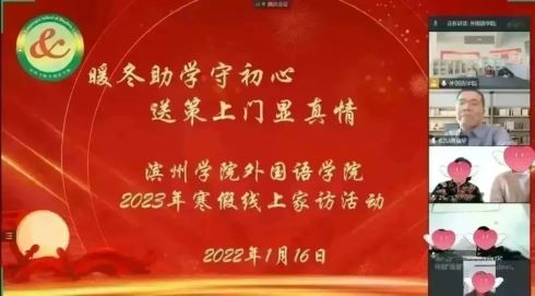 2023年1月16日上午我院开展线上家访活动。辅导员利用腾讯会议、电话等方式,与受资助学生及家长开展线上交流。家访过程中,学院党总支书记曲福华简要介绍了2022年度学校和学院事业发展情况,辅导员认真传达了家庭经济困难学生认定、勤工助学、助学贷款、各项奖助学金、社会类奖助学金等资助政策,宣讲学校对学生的培养和关心。为学生和家长送上新年祝福,给学生新年寄语,勉励他们逆境中迎风生长。