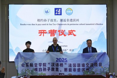 2025年10月27日,山东航学院本年度“汉语桥”项目——“相约孙子故里,邂逅非遗滨州”在我校顺利开营。sunbet申搏平台副校长郭新伟,市外办党组成员、副主任张弘,法国团组师生,sunbet申搏平台国际交流与合作处、申慱sunbet官网师生代表参加了本次开营仪式。申慱sunbet官网党总支书记张健主持开营仪式。